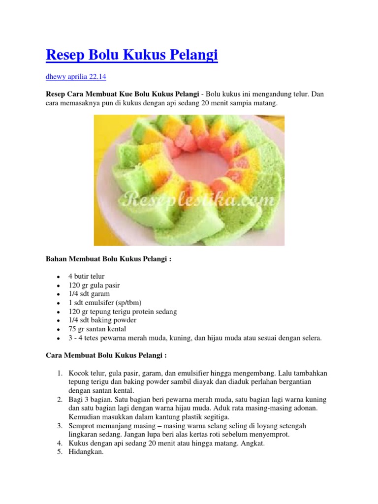 Waktu di indo entah kenapa gak pernah sukses bikin kue ini. Tepung terigu protein sedang250 gram. Lihat juga resep rainbow cake kukus putih telur enak lainnya. Kocok mentega dengan susu hingga merata secara terpisah. Salah satu kreasi kue bolu adalah bolu kukus pelangi. Bolu pandan kukus ini sangat ekonomis bermodalkan 10rb bisa untung 3x lipat perkiraan modal yg saya beli: Panasi steamer kukusan dgn api kecil. Resep bolu pelangi 4btr telur 190 gr gula pasir(klo kemanisan bisa pake150gr) 150 gr terigu 2 sdm susu bubuk(saya ganti. Bolu kukus pelangi memiliki warna yang unik dan begitu menarik. Nah berikut cara membuat bolu kukus pelangi : Berbagai macam aneka resep bolu kukus pelangi,bolu panggang lembut,resep membuat roti bolu panggang dan berbagai aneka resep lainnya. Semprot bergantian di loyang tulban diameter 20 cm yang dioles tipis minyak. Kue klasik khas indonesia sepanjang masa.